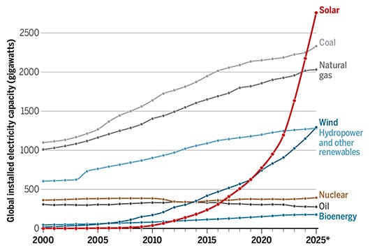 There is a simple reason for the explosive growth of solar power, and for the steady growth of wind power, and it is cost. Both – and especially solar – are experiencing technological advances and are truly mass producible, meaning that their production is able to realize economies of scale. Moreover, storage technologies, mostly batteries, likewise enjoy economies of scale in production and moreover are experiencing fast technological development through research on battery chemistry (e.g., sodium ion batteries).
